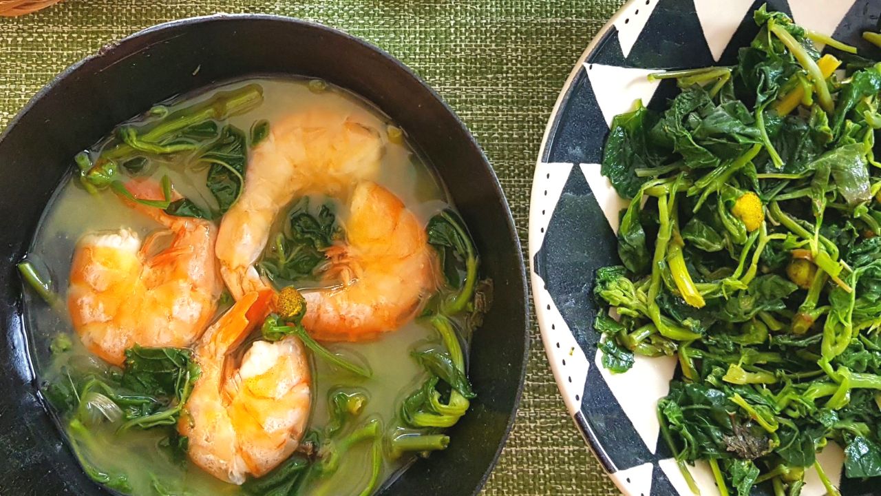 Assim que levantar fervura, coloque os 3 dentes de alho amassados (inteiros), a chicória do Pará (que também é conhecida como coentro baiano ou coentro do maranhão), ½ maço de coentro, 1/4 de xícara de folhas de alfavaca e 5 camarões secos (já vai dando aquele sabor especial).